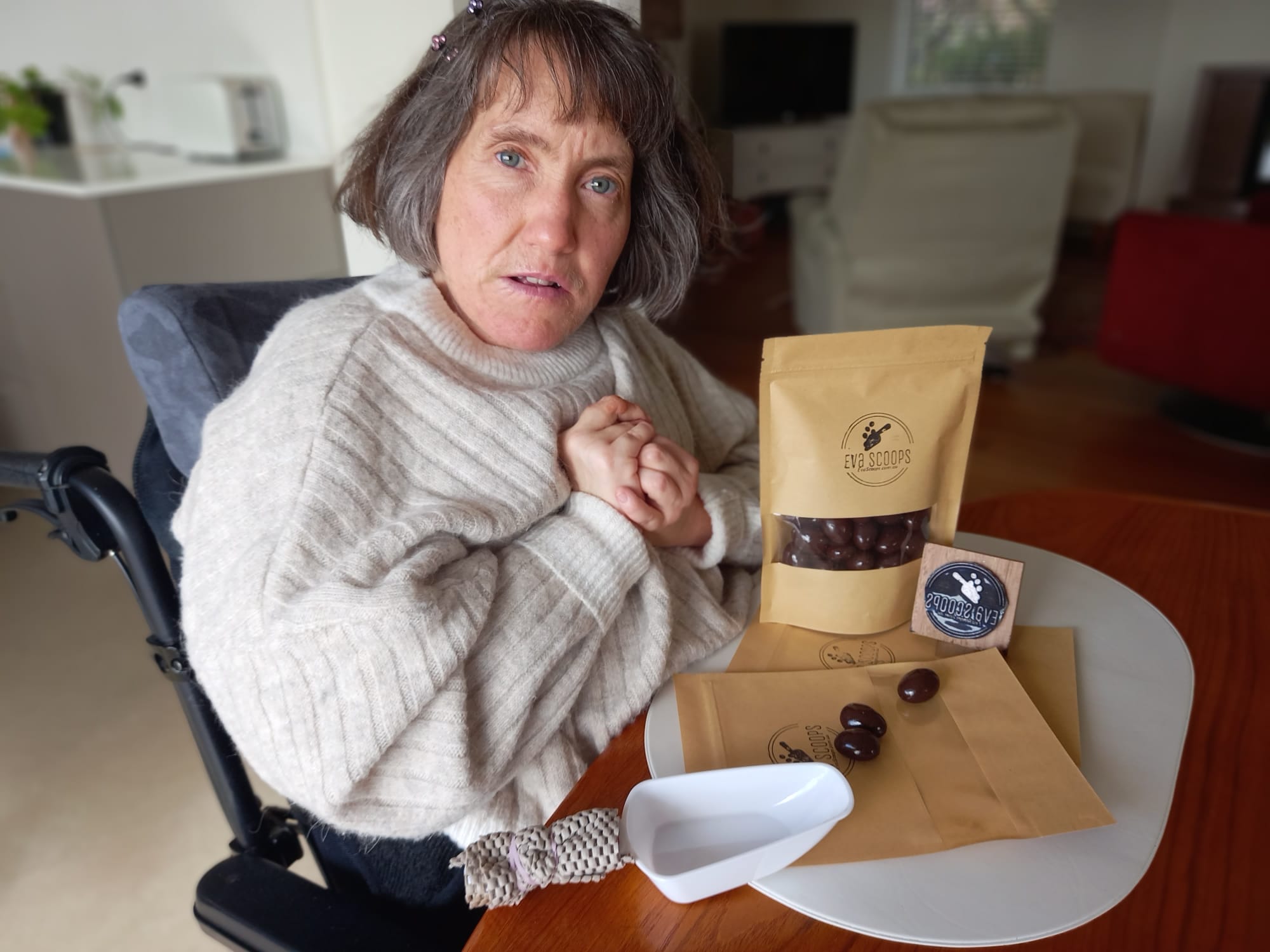 Our friend Eva stopped attending indoor community or volunteering activities during COVID. We have always discussed a range of business opportunities with Eva, but she has not seemed too interested in them. Until chocolate was mentioned. Eva has Rett Syndrome, so she mostly uses her eyes to communicate and needs a bit of help perfecting movements. She is really enjoying getting her business up and running. For most decisions, support staff discuss options with Eva and she uses her yes/no cards to make the final decisions. Eva plans to donate her profits to a charity of her choice, yet to be decided. Thank you for supporting us.