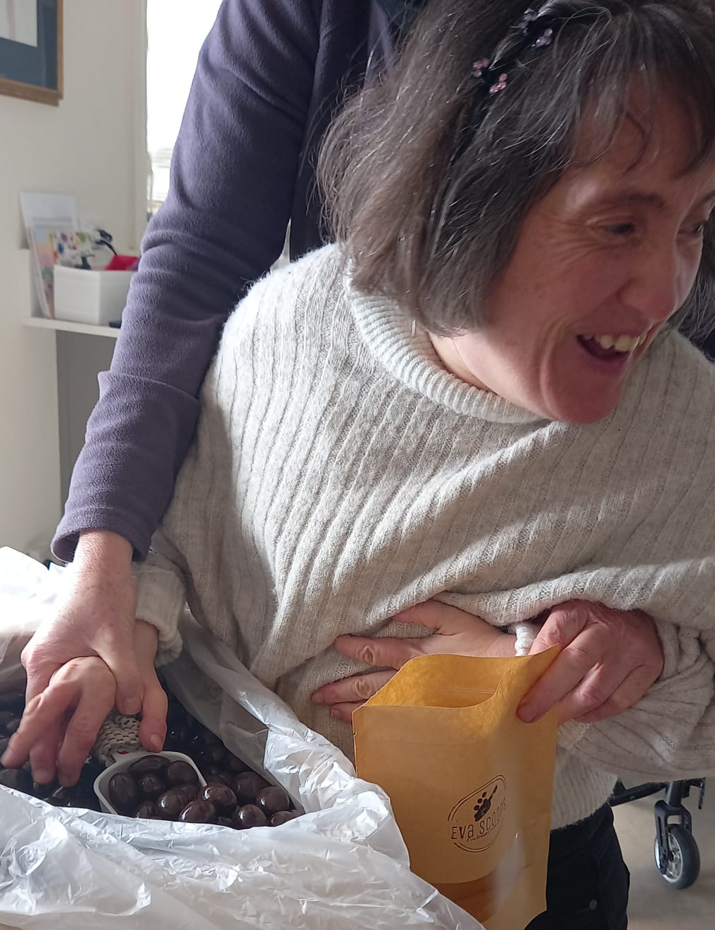 Our friend Eva stopped attending indoor community or volunteering activities during COVID. We have always discussed a range of business opportunities with Eva, but she has not seemed too interested in them. Until chocolate was mentioned. Eva has Rett Syndrome, so she mostly uses her eyes to communicate and needs a bit of help perfecting movements. She is really enjoying getting her business up and running. For most decisions, support staff discuss options with Eva and she uses her yes/no cards to make the final decisions. Eva plans to donate her profits to a charity of her choice, yet to be decided. Thank you for supporting us.